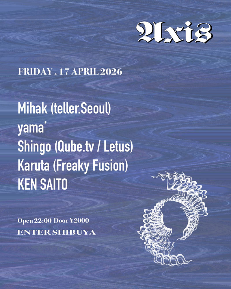 今回はLIVING’レジデンシー、Oddでのミュージックプログラムのディレクターを経て、現在teller.にてレジデントを務めるソウルのキーパーソンMihakを筆頭に、数々のヴァイナルラバーに重用されていた今は亡きレコードショップTechnique、Spice Recordsで長年レコードバイヤーを務め、2度にわたるヨーロッパツアーや東南アジアでのギグ等 活動場所を拡げているyama’の2名がENTERに初登場。さらにQUBE tv、野外パーティLetusでの活動はもちろん、キュレーション/DJ共に駆動力に長けるSHINGOがaxisに再び舞い戻る。そして渋谷MitsukiにてFreaky Fusionを主催する生粋のハマッ子Karuta、そして主催のKEN SAITOが一堂に会す。