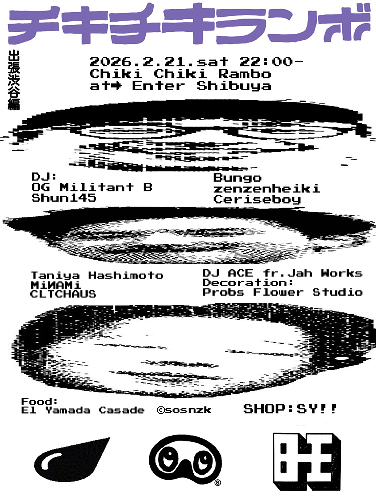 2度目となる今回の出張編では、全国各地よりChiki Chiki Ramboにゆかりのあるバラエティ豊かなラインナップが集結。誰一人取り残すことのない、数多のパーティを通して培われたグルーヴィーなチキチキの熱気を、ぜひ渋谷の地で体感してほしい。