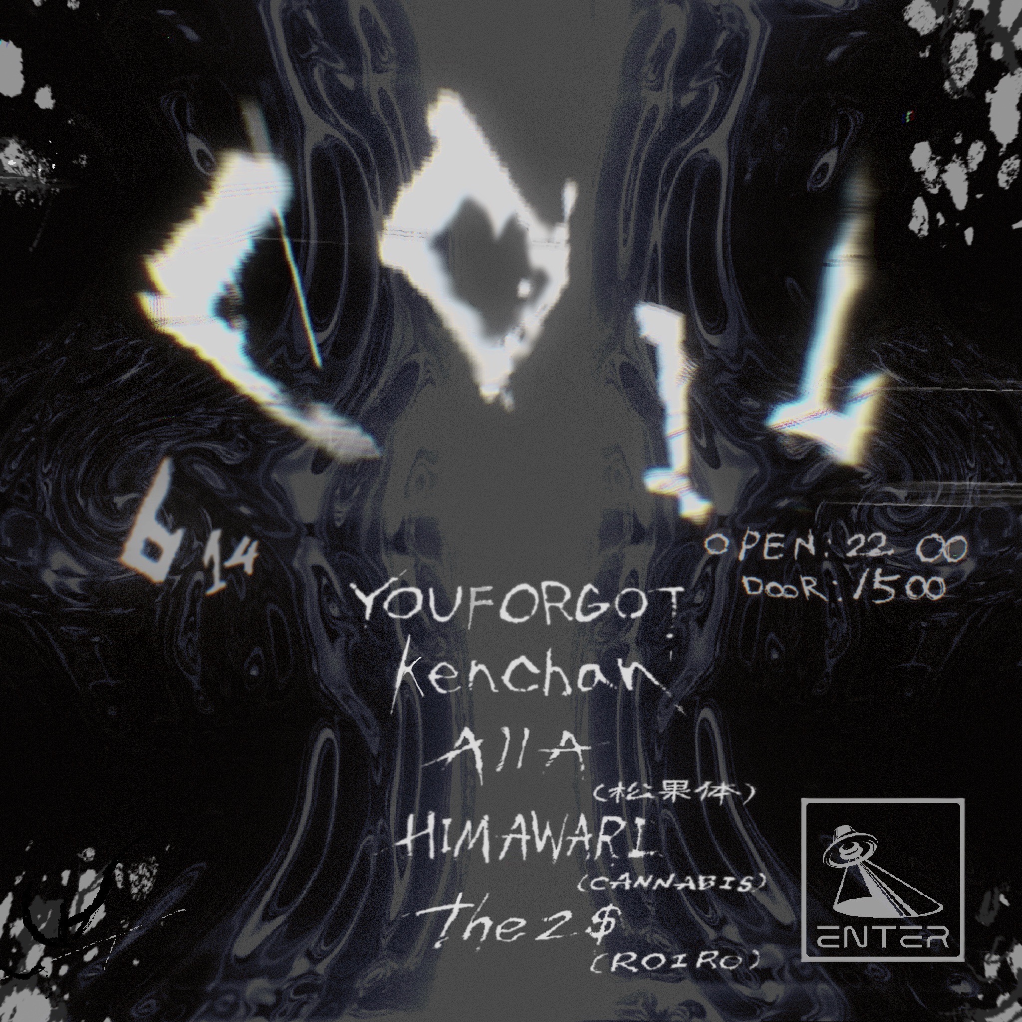 アンビエント、テクノ、ハウス、ジャングル、あらゆるジャンルをボーダーレスに、豊かなスキルと経験値で織り交ぜ、オルタナティブないつ見ても斬新なセットで登場するYOUFORGOT、都内有数クラブでのVJやその巧みなビジュアルメイク力でMVを作成するなど、映像作家・ビートメイカーとしての活動も精力的であるkenchan、ハードコアやポストロックをバックボーンに、音楽制作、松果体のレジデントを務め、その経験値とエネルギーが凝縮されたパフォーマンス力で人気を集めるAllA、CANNABISの中心メンバーでありながら、数々の現場の経験、加えて自身も各所でクラブを遊び歩き、膨大なインプットから生まれる高い選曲力とスキルに定評があるHIMAWARIが登場。