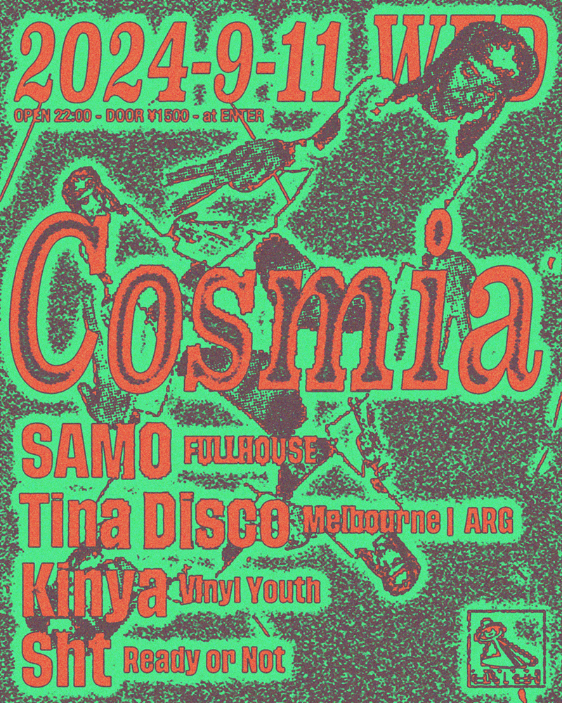 Ready or NotのShtが仕掛けるCosmia。今回はラテンベース、トライバル、アフロハウスを操り、アシッディーで無限のグルーブを紡ぎ出すグッドバイブスDJが揃った。今や知らない人はいないまでにその存在を轟かせ、大阪のDJコレクティブFULLHOUSEのレジデントとしての活動はもちろん、nasthugと新パーティUTAGEをローンチするなど、フロアを解放するSAMOを迎え、メルボルンを拠点に活動するプロデューサー/アヴァンギャルドアーティストのTina Disco、Vinyl YouthのKinya、笑顔あふれるグッドバイブスで様々なギグでのDJを吸収し急成長、現在Mitsukiでも開催されているReady or Notを主催するShtが出演する。ラテンベース、トライバル、アフロハウス、バイレファンキ、あらゆるハウスミュージックに各々のバックボーンからアプローチする一夜。平日から遊び呆けるのに絶好のパーティ、グッドバイヴスオンリーなCosmiaで水曜日から踊り明かそう。