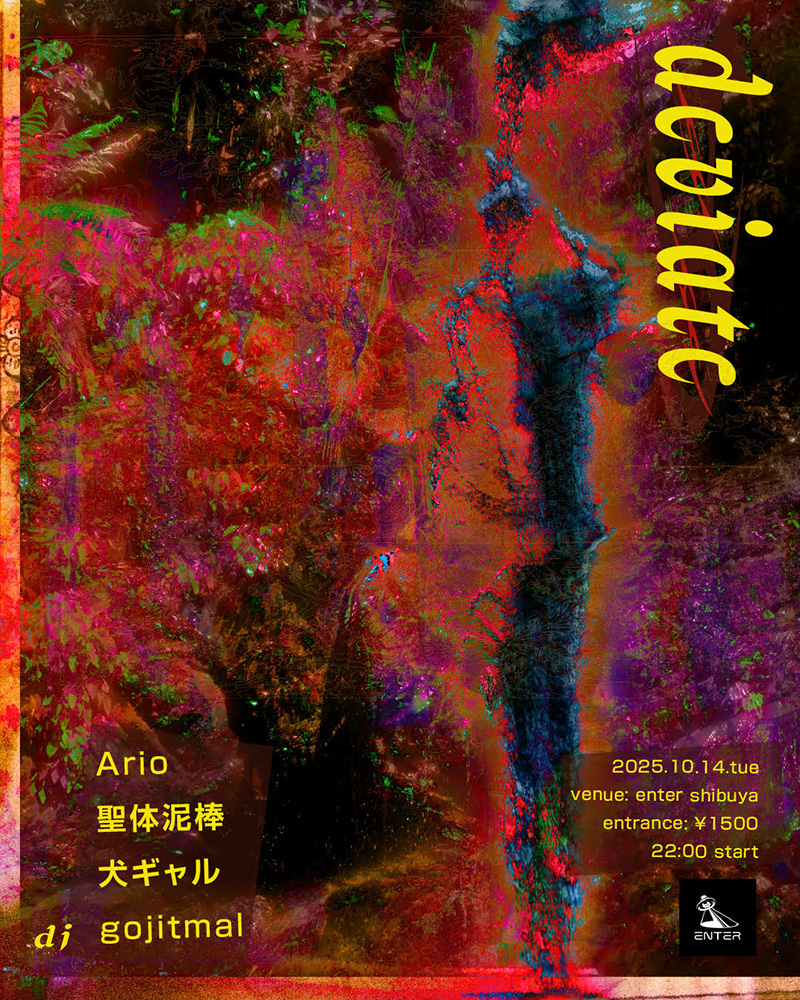 〈Astral Industries〉のキュレーターであるArio、DOG RUNを主催する犬ギャル、愛知出身のDJ 聖体泥棒、渋谷を中心に活動し昨年9月にスペイン・バルセロナのテクノレーベル〈APsychoMagicStory〉よりEP「CUERVOS」をリリースしたgojitmalが出演し、逸脱と歪曲が重なり合うダークテクノの世界へと導く