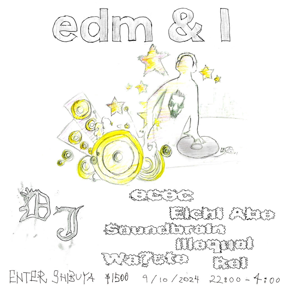 今回のイベントのタイトルは、edm & i です。いわゆるEDMパーティは、その性質から、現在におけるクラブシーンにおいて半ば迫害された存在であると言っても過言ではないかもしれません。その性質とは、実際のクラブにいるお客さん、流れている音楽、そしてそれらを包括する全体的な雰囲気を指しています。私たちが今回実行しようとしているのは、そのような性質を持ちません。なぜなら、私たちはそのようなEDMパーティと、その目的と動機を異にしているからです。 edm & i、つまり、EDMと私が互いに見つめ直すこと、私たちが幼少期、思春期に素朴に聴いていたEDMを、大人になり、様々な音楽の趣向の変遷を経て、それぞれの形で保持している中、それをもう一度正面から対峙してみることで、新しい意味を発生させよう、というのがこのイベントのテーマです。