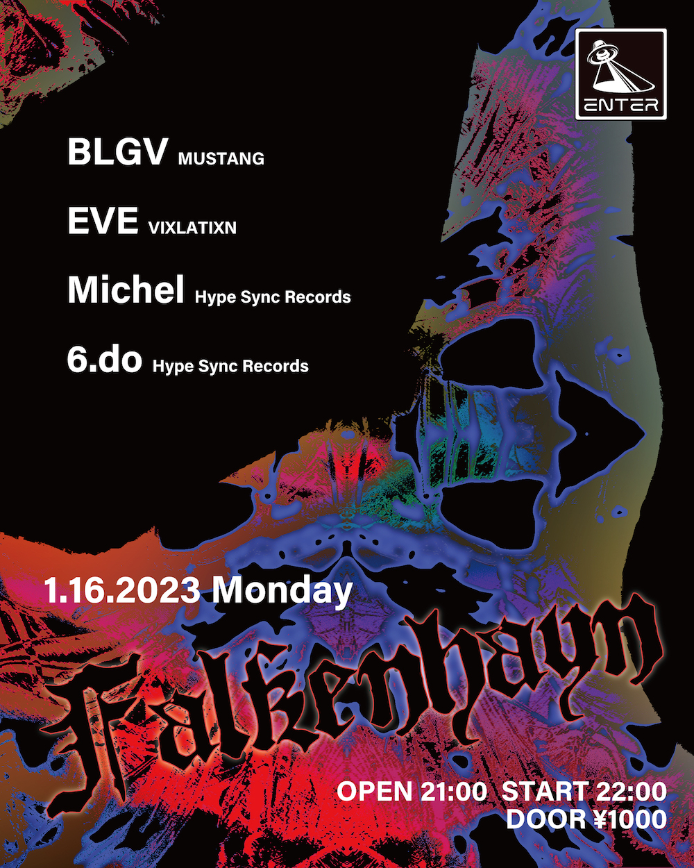 現ハードテクノシーンを担うパーティ、レーベル、〈MUSTANG〉と〈VIXLATIXN〉からBLGVとEVEが登場する。そして若手最注目クルー、レーベル〈Hype Sync Records〉からMichelと6.doも登場する。