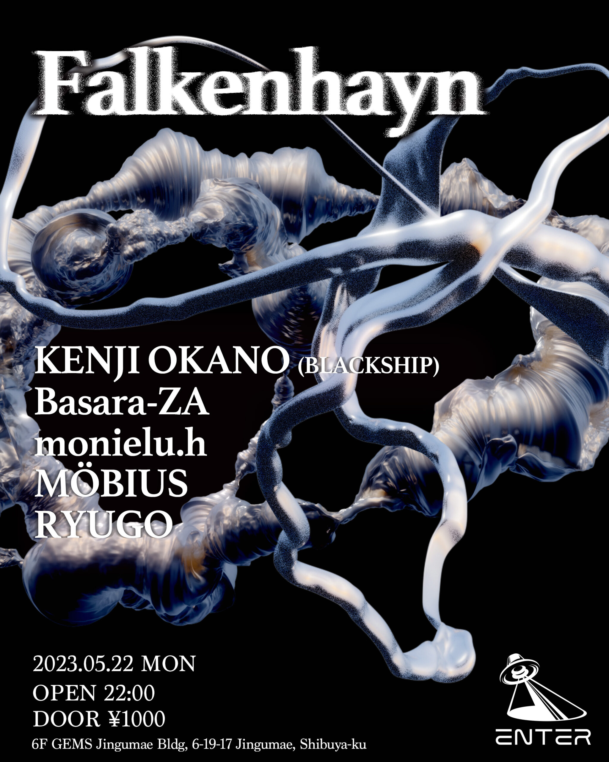 DJデュオBLACKSHIPのKenji OkanoがENTER初登場。楽曲提供やパーティー開催でダンスフリークたちを賑わせるBasara-ZAや、フロアに合った独自のグルーヴを持つmonielu.h、今回はテクノセットを披露するEDMフリークのMÖBIUS、ペインティングアーティストのRYUGOが共演する。