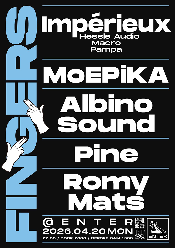 Romy MatsとAlbino SoundsによるFingersが、〈Hessle Audio〉や〈Pampa〉、〈Macro〉等の著名レーベルからリリースを重ね、Ben UFOやDixon、Caribouらからも支持を受けるDJ/プロデューサーのImpérieuxを招聘。ローカルからはMoEPiKAと〈Hekdb〉のファウンダーPineがラインナップ。
