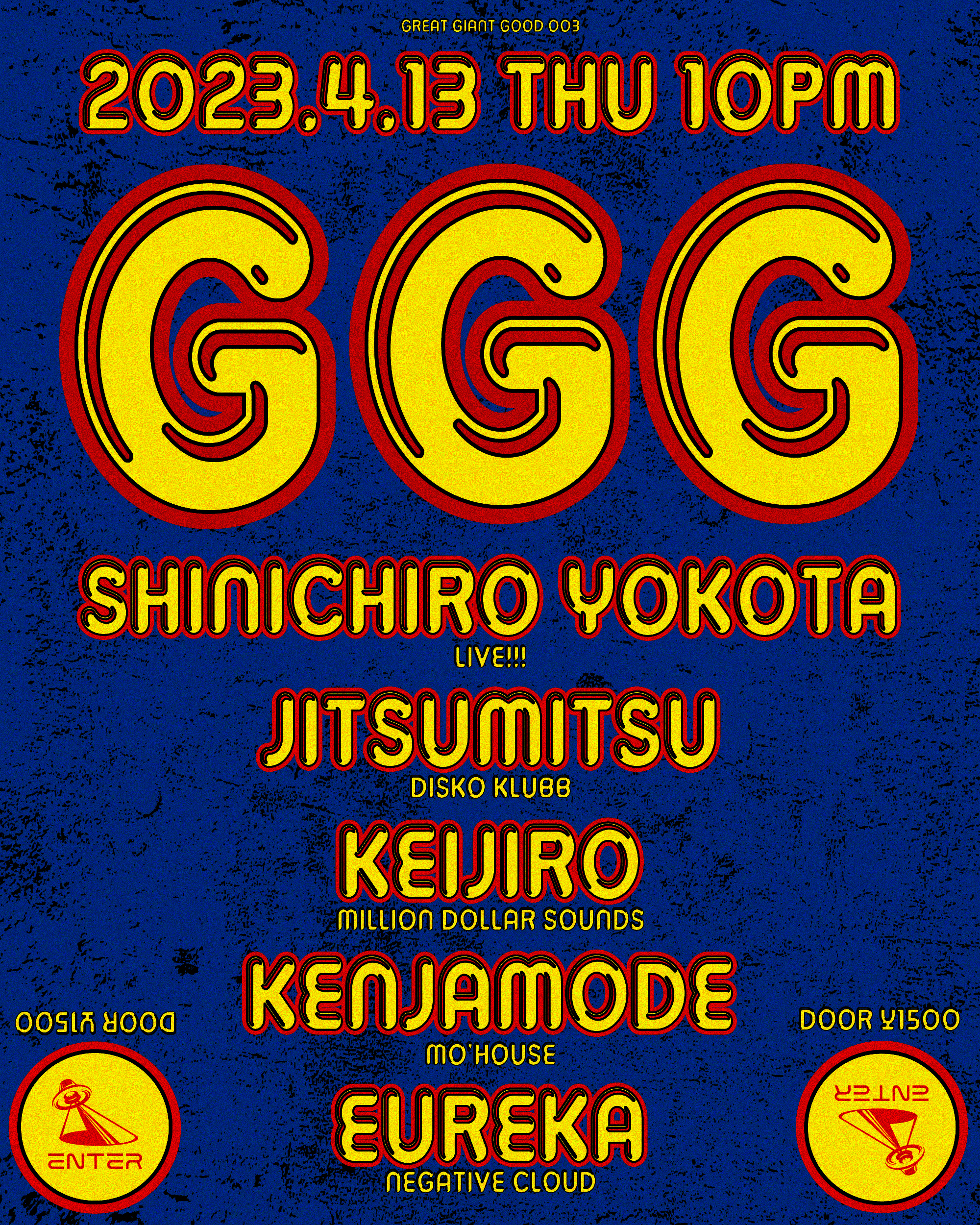 「Great Giant Good」を掲げるEUREKAとkenjamodeによるパーティ。今回はジャパニーズハウス創世記のレジェンドプロデューサーShinichiro Yokotaによるライヴセットに加え、DISKO KLUBBのレジデントJitsumitsu、Million Dollar SoundsからKEIJIROが登場。