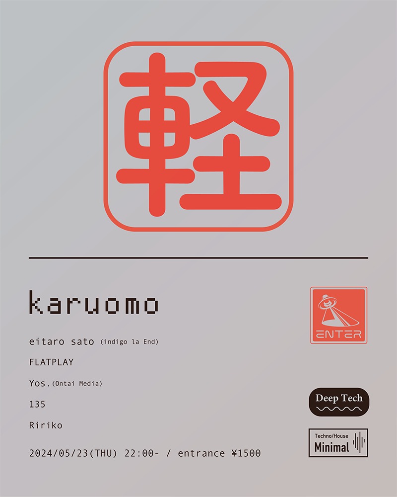 新宿麦ノ音でデイパーティとして開催されてきた、ミニマルパーティkaruomoがベニューを変えてENTERにて初のオールナイト開催。