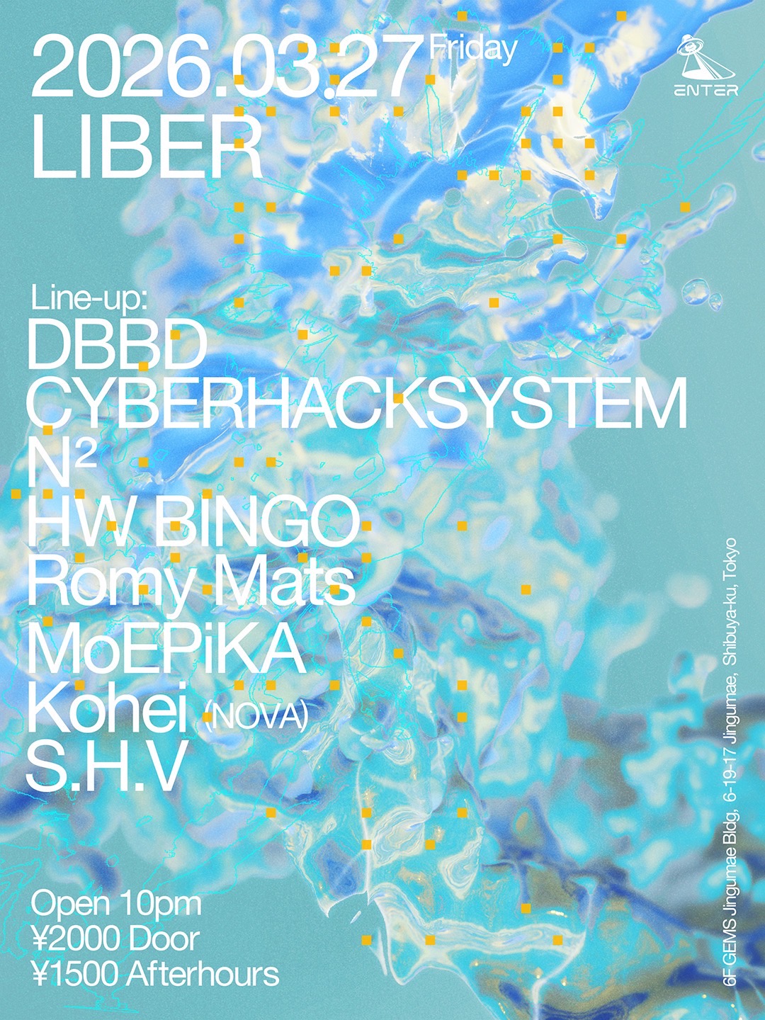 電子音楽マニアを唸らせる新進気鋭のアーティストを呼び集めるLIBER。現行のカルチャーの中心を担うであろう若手のアーティストが邂逅する。今回はベルリンよりDBBDが急遽出演!古代ローマの生産と豊穣と酒の神であるLIBERの名の通り、瞬間毎に音楽が創造される贅沢な夜会がENTERで開かれる。