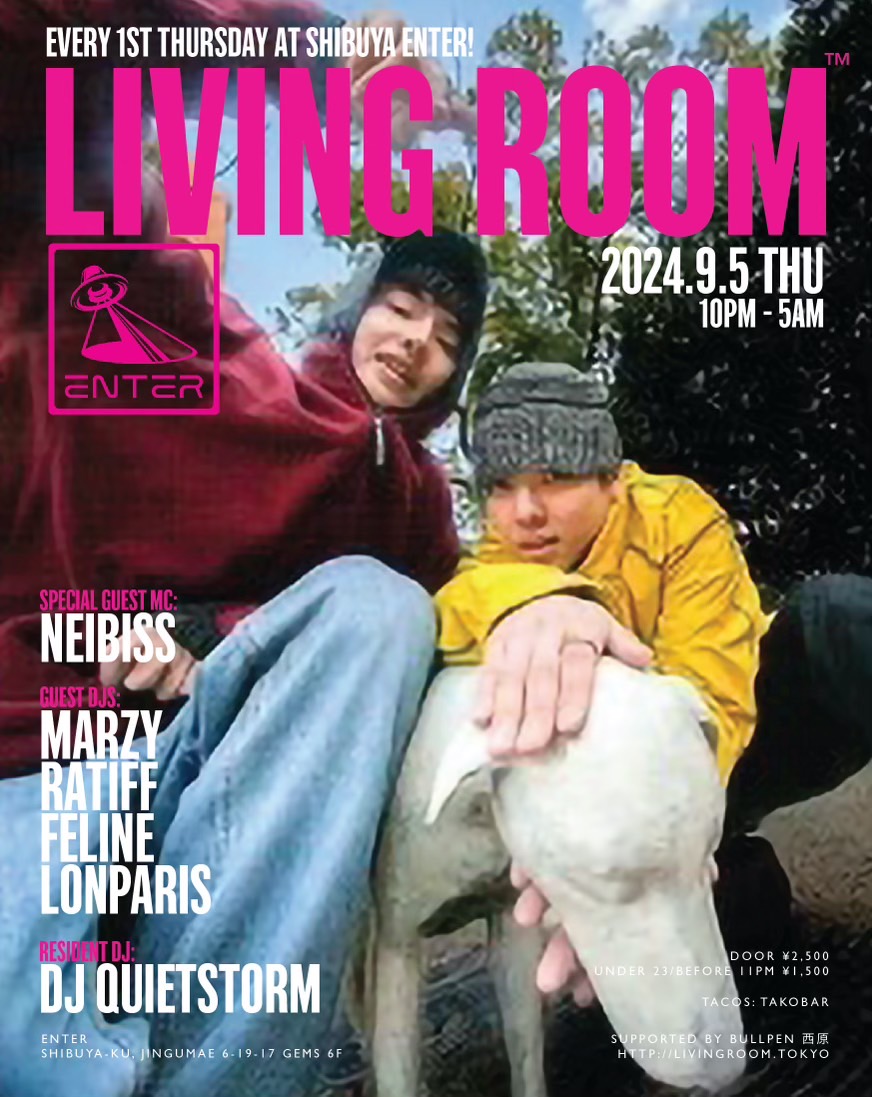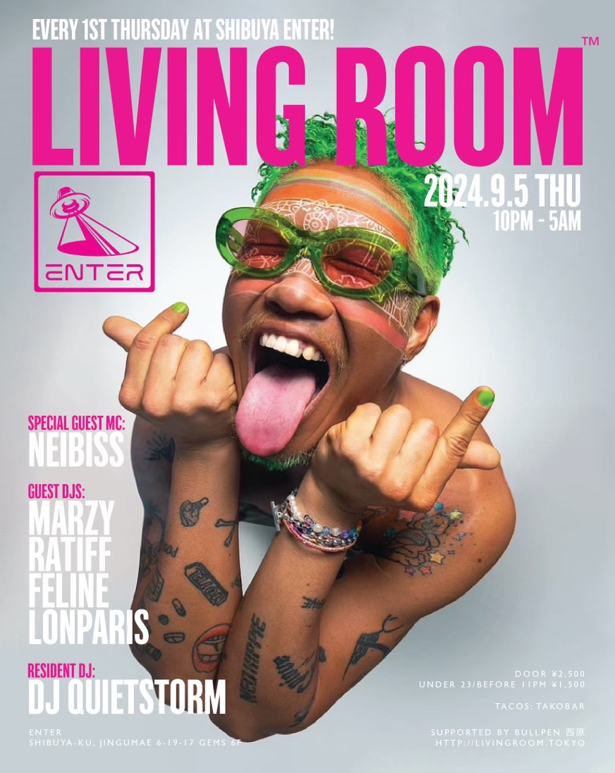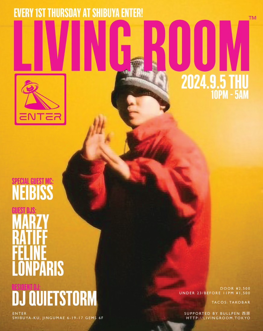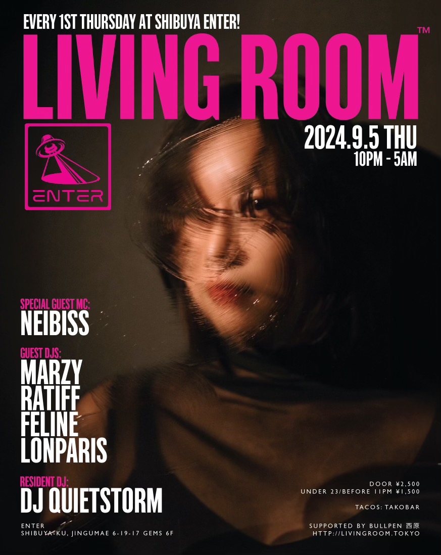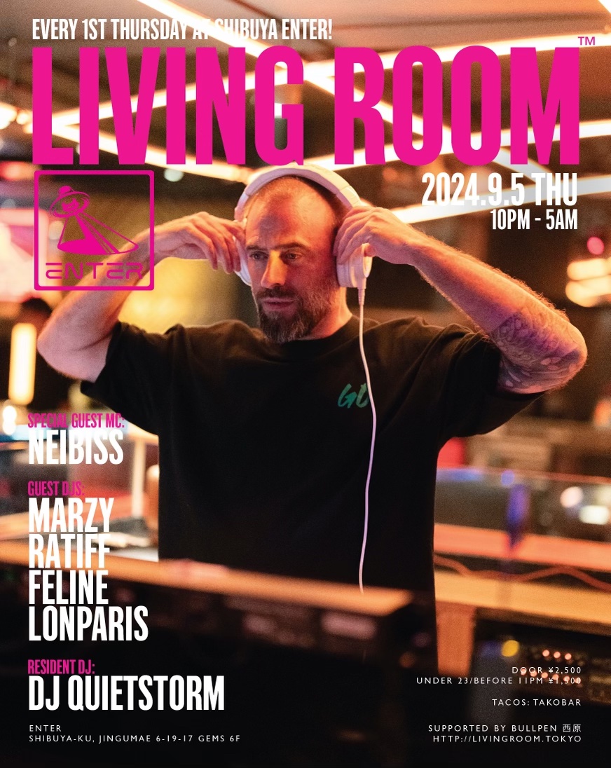 ヒップホップ/ハウス/ジャズに限らず、様々な手法で独自の音楽を提示し続けた真の音楽家であるDJ QUIETSTORM。彼だからこそ為し得ることのできる特別な一夜にはこれまで、平日のパーティにも関わらず様々なジャンルのトップDJ/アーティストだけでなく、これからの音楽を担う若いアーティストを招き、音楽を愛する多くの人々を魅了してきた。 代官山UNICE→渋谷contactを経て、渋谷ENTERではソファーに座ってのDJスタイルではないがダンスフロアー中央にブースが位置する新しいスタイルがLIVING ROOM™のコンセプトにマッチし毎回素敵な空間となっている。