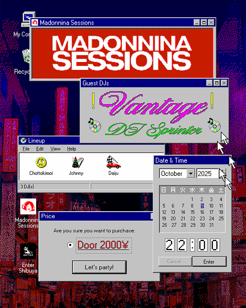 Madonnina SessionsがEnterに初登場。スペシャルゲストにVantageとDJ Sprinterを迎え、パーティレギュラーのChottokimoi、Johnny、Daijuとともに、ハウス、ブレイクス、ベースミュージックで一夜を彩ります。