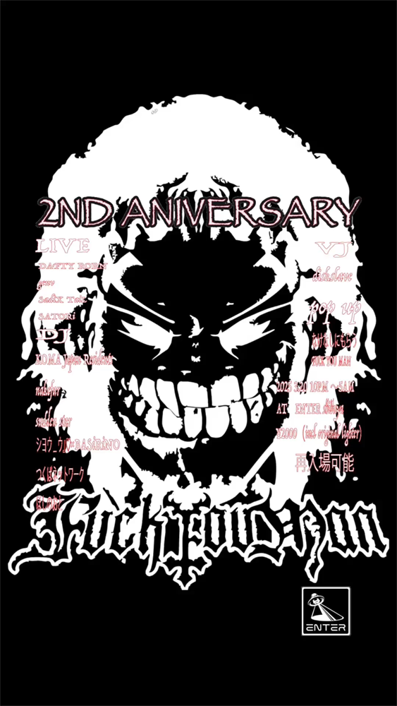 なけなしにもらう fuck you man presents its 7th event and 2nd anniversary party on March 20th at Enter Shibuya. Featuring upper DJs, live artists, and VJ Diskslave, a hard party is expected. Plus, all attendees will receive an original lighter! Don’t miss it—come and join us!