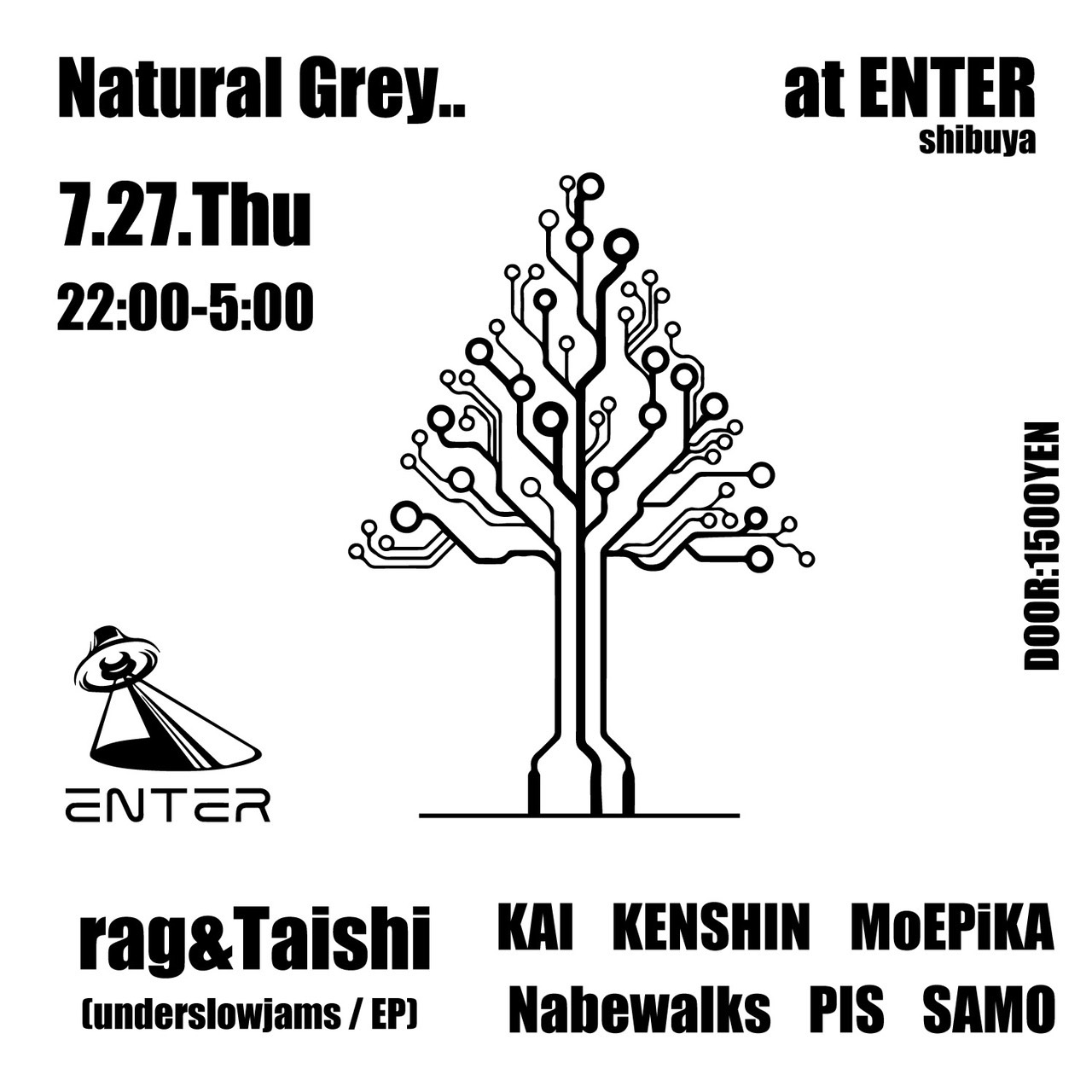 様々なヴェニューで活動しているプロデューサーやDJを招くnatural grayの3回目は、前回に引き続きKENSHIN、YENTOWNに所属するNabewalks、UKファンキーなSAMO、幅広い選曲のMoEPiKA、KAIが出演。更に今回はビートを自由自在に織り交ぜるTaishi、underslowjamsからラッパーragを招き、フリースタイルのMCを披露する。
