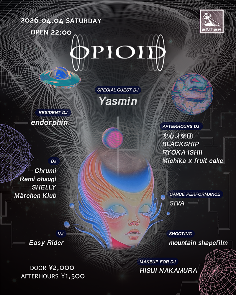 彼女のキュートで引き締まったシャープな外見からは想像もつかない、アシッド且つファットなベースラインでゴリゴリに攻めてくる強く鋭い選曲は東京テクノヘッズ達を深いアジアンカオスへと導くだろう。レジデントを務めるendorphinは今回、野生的で疾走感のあるスタイルで人気のダンスパフォーマンス集団 SIVA とのコラボレーションセットを披露。また近年 BEN KLOCK の貴重な日本公演において毎回指名を受け絶大な信頼を得る Chrumi がラインナップ。彼女のセンスと安定感が同居するセットに期待大。 また2025年 BORDER ONEの出演と共に注目を集めるパーティ Traffic Jam を主宰するSHELLY、繊細且つ緻密に構築される彼女の深いトリップ感あるセットにも注目。そしてテクノ・トランスレーベル〈KAGRA〉を主宰するDJ兼プロデューサーREMI OHSUGIはサイケデリックな音質とトロピカルで官能的なグルーヴを繊細なリズムで紡ぎ、フロアを深い催眠状態へと誘う。アフターアワーズは OPIOIDの特徴的な流れとして定着しつつある、緊張感あるテクノ空間を開放するハッピー且つグルーヴィーでエモーシャルな展開を表現するに相応しい、空心才楽団、BLACK SHIP、MICHIKA × FRUIT CAKEのB2Bセットがラインナップ。大トリはクロージングセットの定評が高く、長年endorphinとパーティを共にする盟友RYOKA ISHIIが務める。
