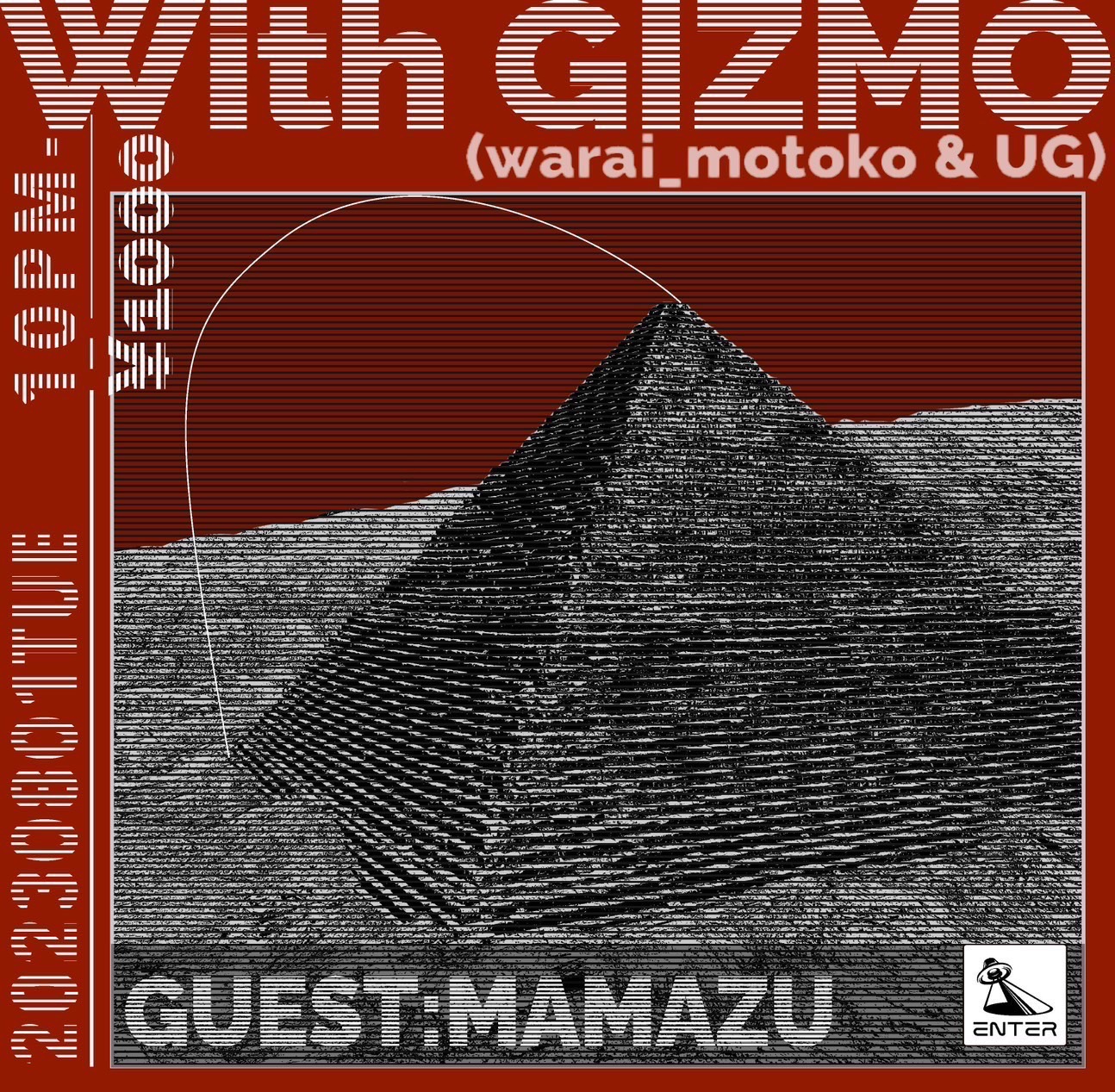 ENTERのアフターアワーズを盛り上げてきた、UGとRave Racersのメンバーwarai_motokoによるスニッフィングミュージックデュオGIZMOが、ゲストを呼び共演するWith GIZMOを始動。記念すべき初回のゲストは〈HOLE AND HOLLAND〉所属のMamazu。ローカルなDJバーから大規模な野外まで、独自の視点で形成される有機的なプレイで、国内大型フェスFUJI ROCK Festivalを始め、Cassio、Boiler Room、NTS Radioなど海外でのプレイも多くこなす彼は、プロデューサーとして楽曲制作にも才能を発揮し、アパレルショップへの楽曲提供、気鋭レーベルからはリミックスを発表。Andrew WeatherallをはじめAcid ArabやEYE、Jane Fitz、Dengue Dengue Dengue、Martha Van Straatenなど海外有数DJにも多くプレイされている。2021年には世界の伝統音楽を当世流に表現した新レーベル〈SABI〉を始動させ、更に勢いを増すMamazuとGIZMOによるディープな融合をぜひ体験してほしい。